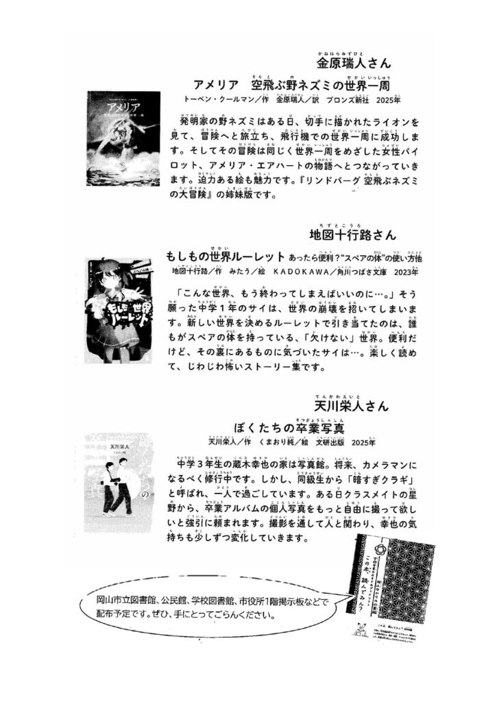 雄叫 2025.10.31 10/27~11/9まで全国読書週間 “岡山ゆかりの作家”の作品を読んでみませんか? 2025年10月31日 Post navigation Previous: 2025.10.30 平和とは?Next: 2025.11.04 2025賃金確定交渉 みんなの声で、改善を実現させよう!