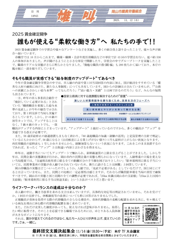 雄叫 2025.11.12 2025賃金確定交渉 誰もが使える“柔軟な働き方”へ 私たちの手で!! 2025年11月12日 Post navigation Previous: 2025.11.11 2025賃金確定交渉 みんなの声(要求)を市労連に結集させ改善を求めよう!Next: 2025.11.13 2025賃金確定交渉 どの職員も安心して働くことのできる環境へ