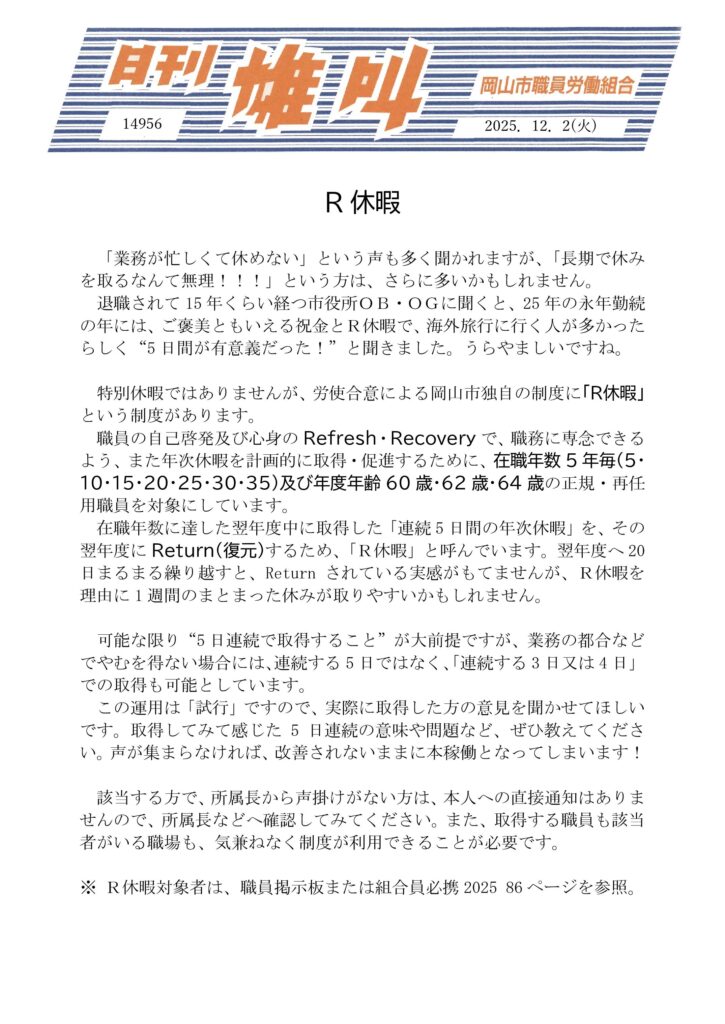 「地域住民の幸せなくして 自治体労働者の幸福はない」市民のために職員が活き活きと働いていけるよう、岡山市職員労働組合は日々さまざまな取り組みを行っています。
