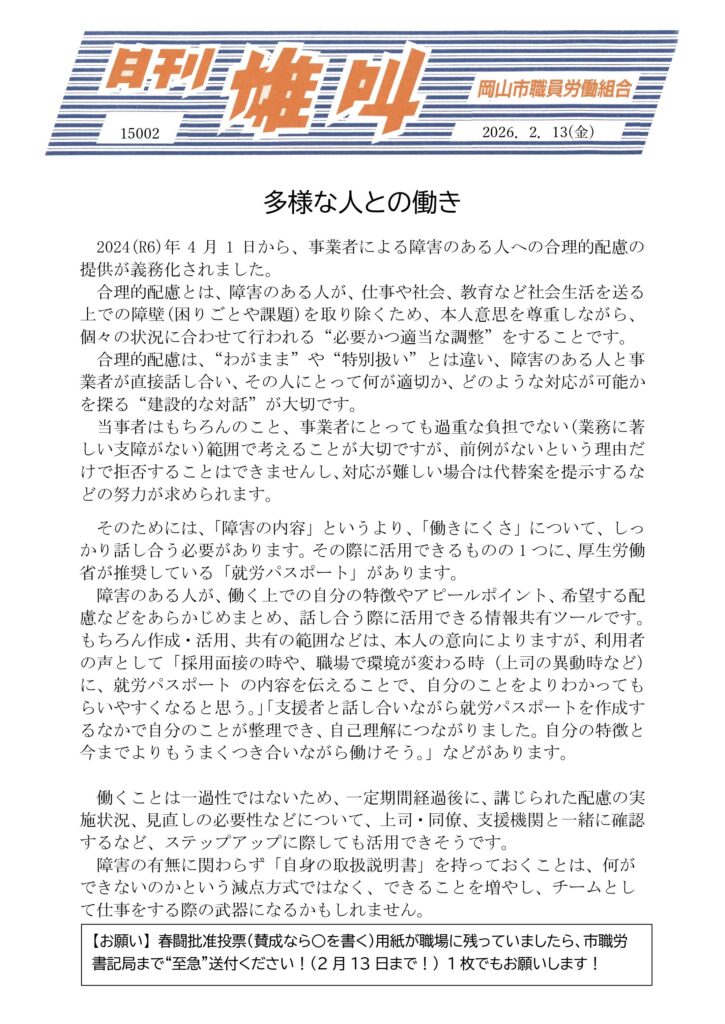 「地域住民の幸せなくして 自治体労働者の幸福はない」市民のために職員が活き活きと働いていけるよう、岡山市職員労働組合は日々さまざまな取り組みを行っています。