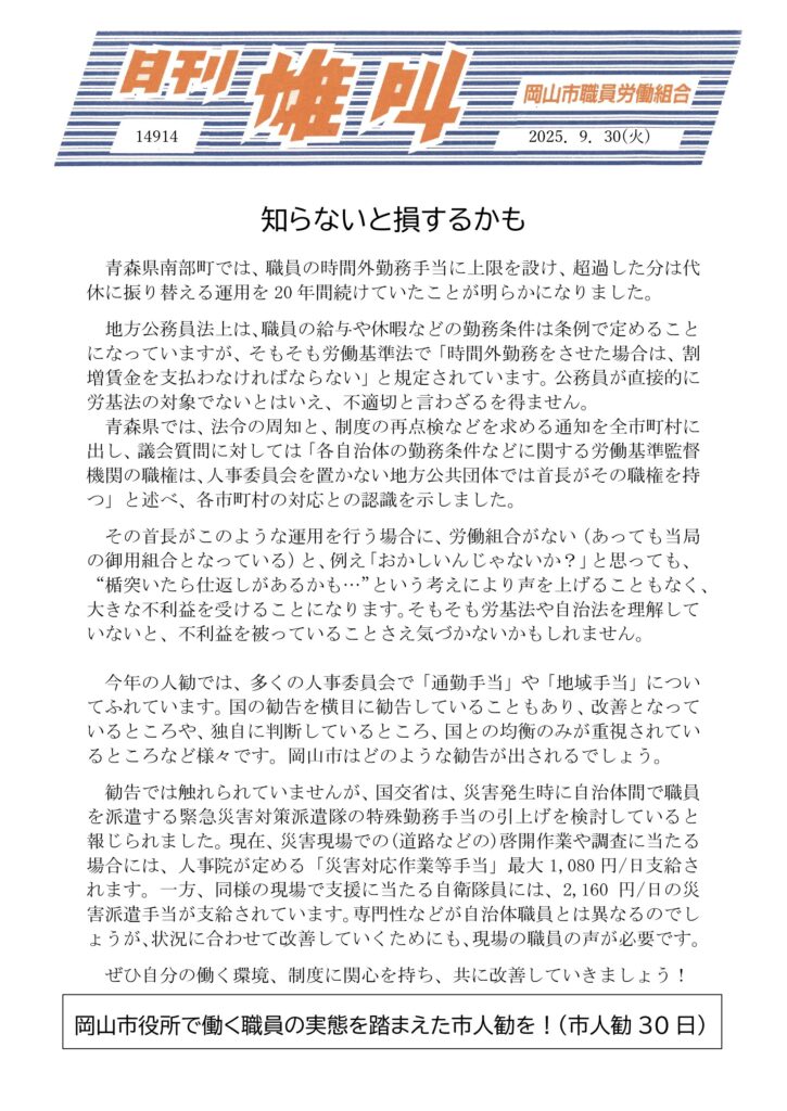 雄叫 2025.09.30 知らないと損するかも 2025年9月30日 投稿ナビゲーション 前: 2025.09.29 重視するのは何か?次へ: 2025.10.01 2025賃金確定闘争 岡山市人事委員会勧告 4年連続プラス勧告も、職員の不公平感の解消には至らず!