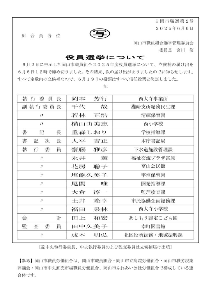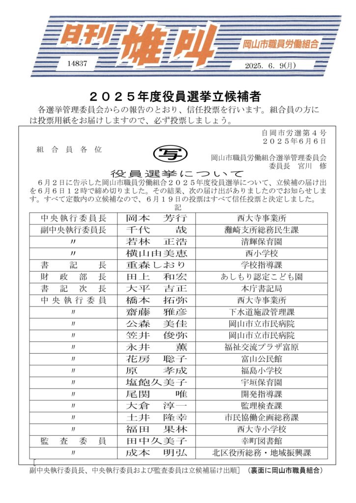 雄叫 2025.06.09 2025年度役員選挙立候補者 2025年6月9日 投稿ナビゲーション 前: 2025.06.06 投書 声をあげた!次へ: 2025.06.10 安心して休むこともできる人員体制