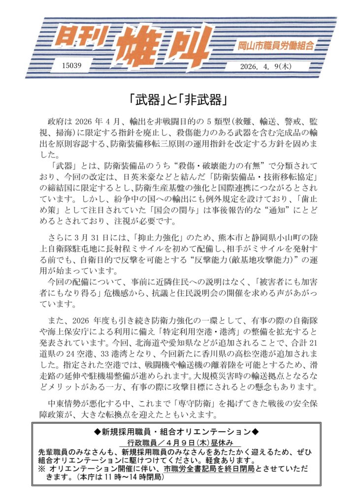 雄叫 2026.04.09 「武器」と「非武器」 2026年4月9日 投稿ナビゲーション 前: 2026.04.08 ジェンダー署名へご協力を!次へ: 2026.04.10 社会を変えるための行動 ~May Day~